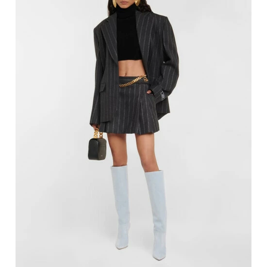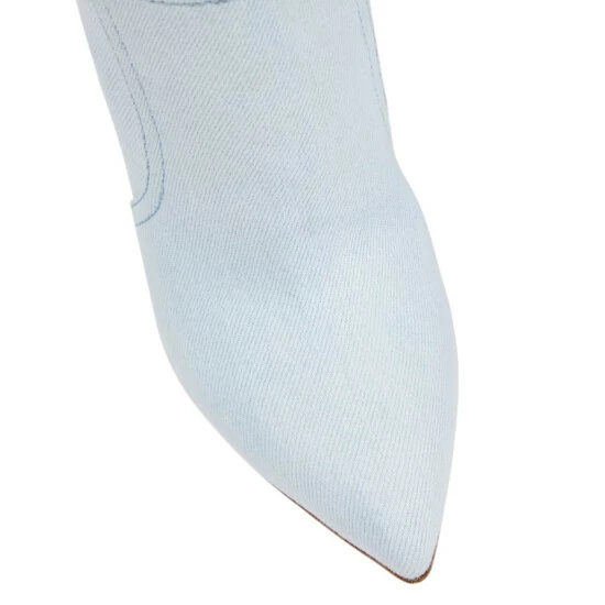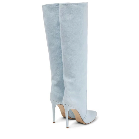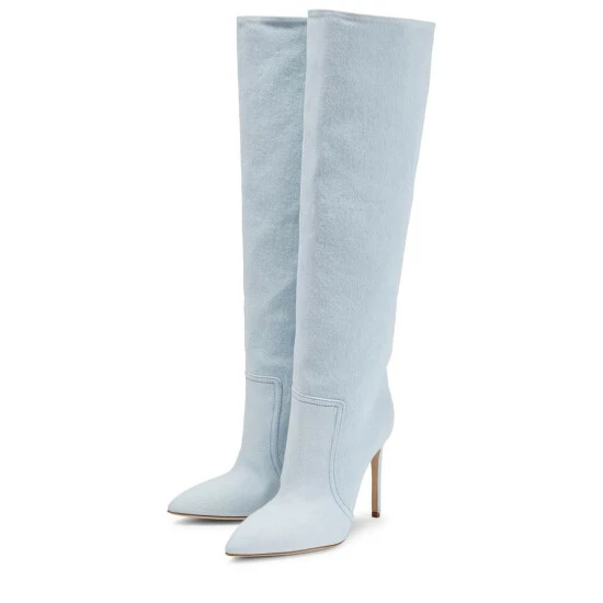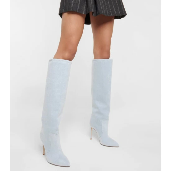 Finish top-to-toe denim looks with these glamorous knee-high boots from Paris Texas. Made in Italy from light-wash denim, they feature contrasting topstitching, pointed toes, and towering stiletto heels.