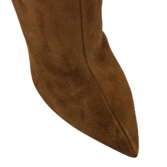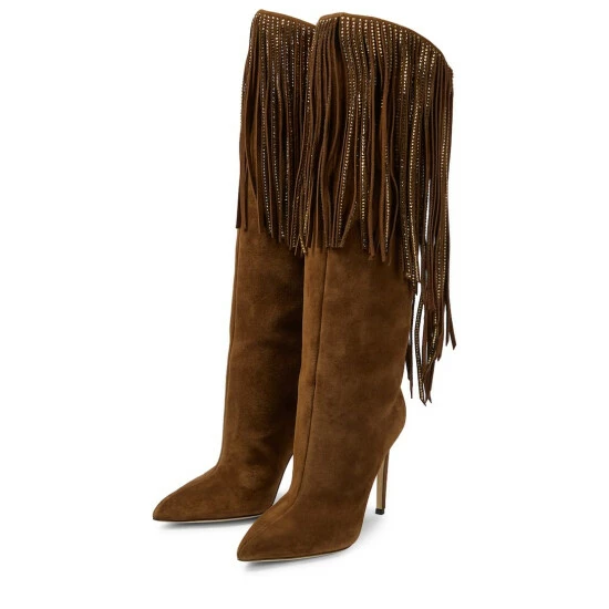 These knee-high boots from Paris Texas are accented with crystal-embellished fringes. The glamorous style is made in Italy from smooth brown suede and set on daring stiletto heels.
