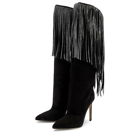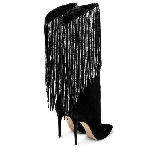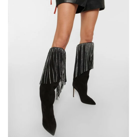 These knee-high boots from Paris Texas are accented with crystal-embellished fringes. The glamorous style is made in Italy from smooth black suede and set on daring stiletto heels.
