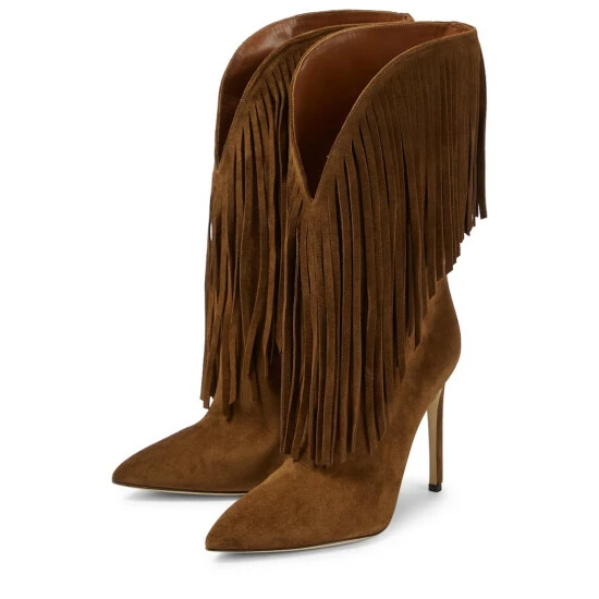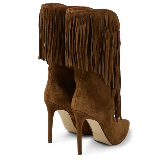 These ankle boots from Paris Texas are made in Italy from smooth brown suede. They’re accented with fringes at the collars and feature pointed toes with slinky stiletto heels.