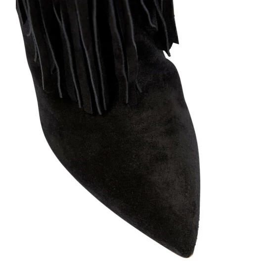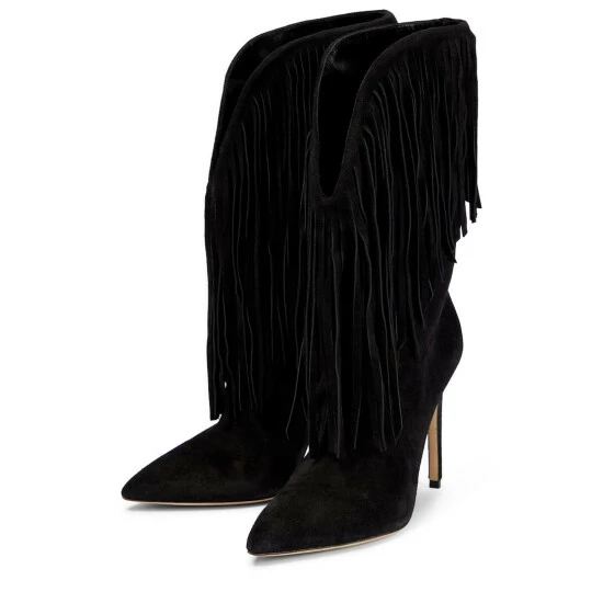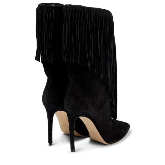 These calf-length boots from Paris Texas are made in Italy from smooth black suede. They’re accented with fringes at the collars and feature pointed toes with slinky stiletto heels.