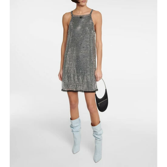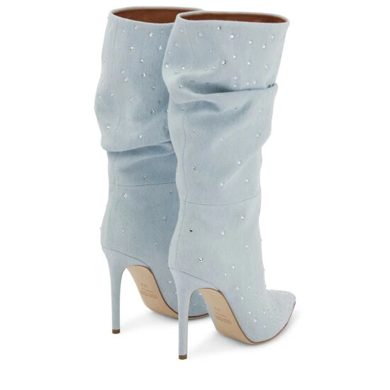 Paris Texas updates the Holly boots with light denim and glittering crystal embellishments. Made in Italy, they have slouchy collars, pointed toes, and daring stiletto heels.