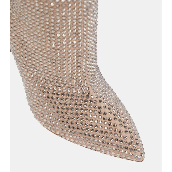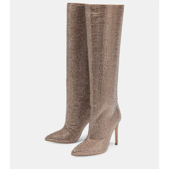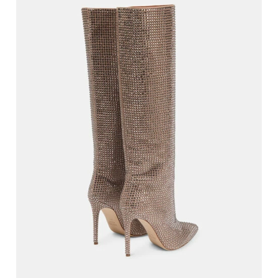 Make an entrance in the Holly knee-high boots from Paris Texas. They’re made from beige suede and encrusted with shimmering crystals. 105mm stiletto heels and piercing point-toes complete the striking duo.