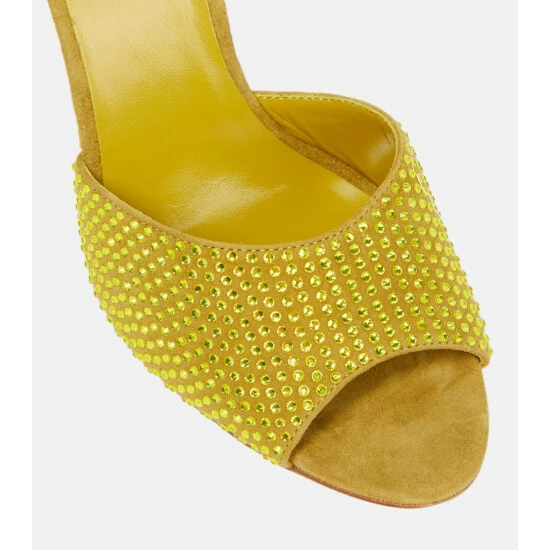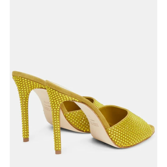 Covered in glistening crystals, the Holly mules from Paris Texas are sure to become your go-to party shoe. Made from yellow suede, they have a round toe and towering stiletto heels.