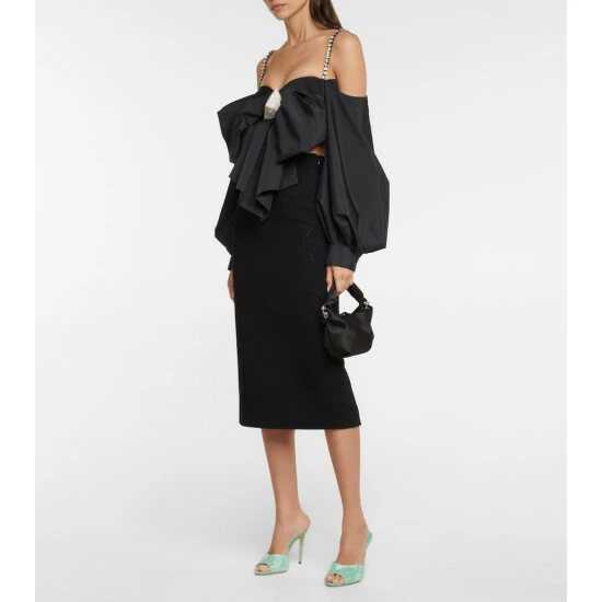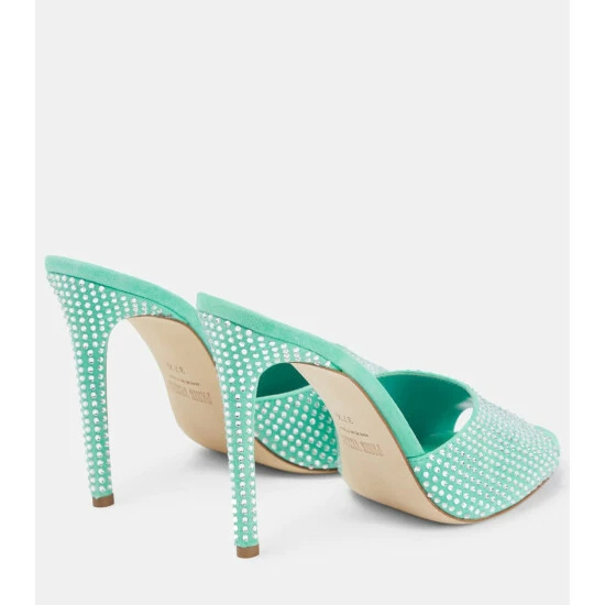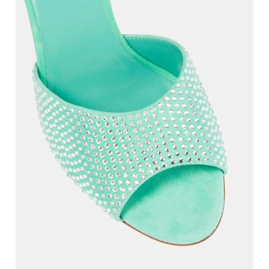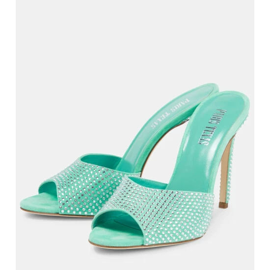 Covered in glistening crystals, the Holly mules from Paris Texas are sure to become your go-to party shoe. Made from aqua-green suede, they have a round toe and towering stiletto heels.