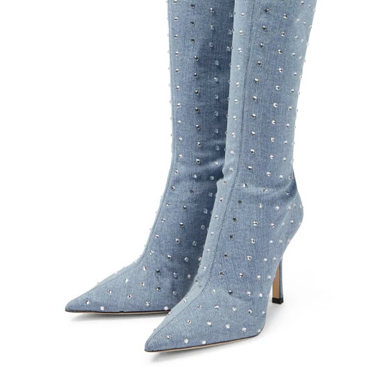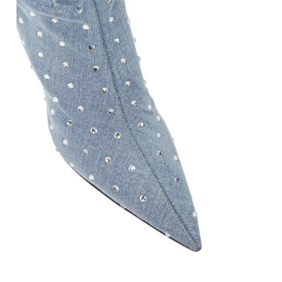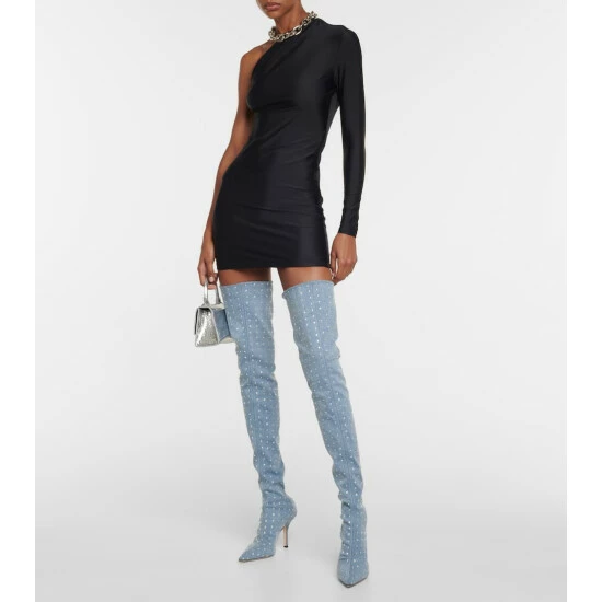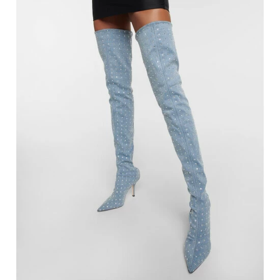 The Holly Mama over-the-knee boots are made in Italy from denim. Enriched with glittering crystal embellishments, they feature piercing point toes and stiletto heels for equal parts allure and edge.