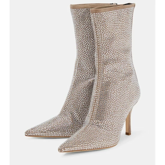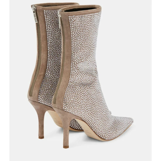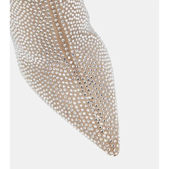 Make an unforgettable entrance in Paris Texasβ Holly ankle boots. They’re made from beige suede encrusted with shimmering crystals. Stiletto heels and razor-sharp profiles complete the striking duo.