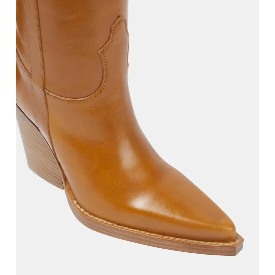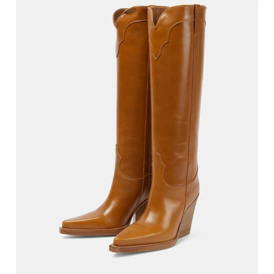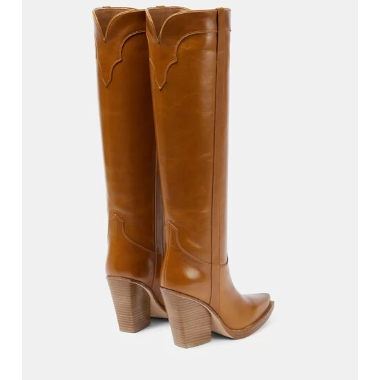 Paris Texas gives a modern spin to the classic Western silhouette with these knee-high boots. Crafted from tan brown leather, they have panel stitching and are set on stacked block heels with pointy toes.