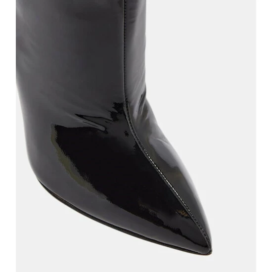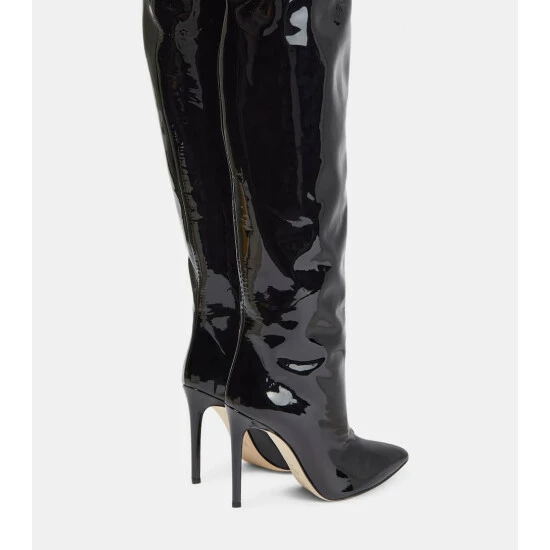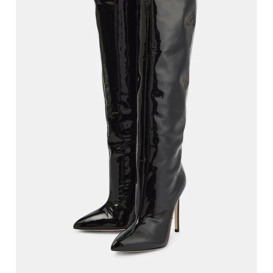 Paris Texas renders its signature over-the-knee boots here in glossy black patent leather. The skin-tight pair has piercing pointed toes, and is set atop sophisticated stiletto heels.