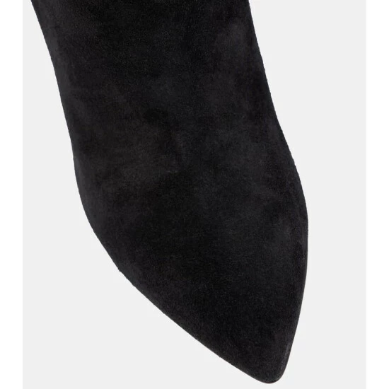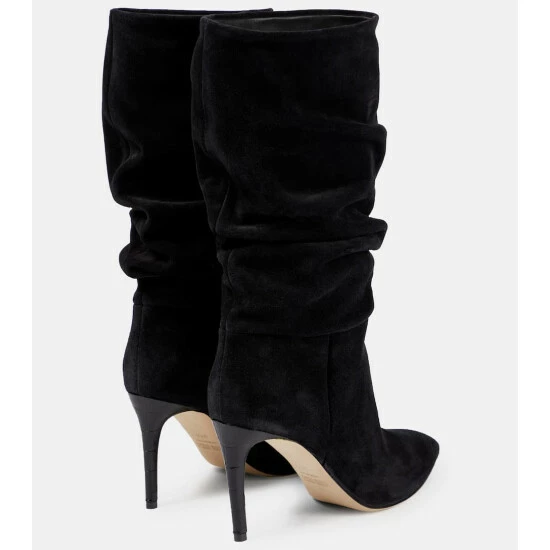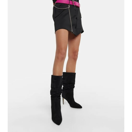 Center your next after-dark ensemble around these slouch-collared suede boots from Paris Texas. They’re shaped to pointed toes and mid-calf shafts. Note the scale-embossed stiletto heels for a subtly striking finish.