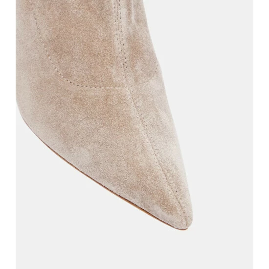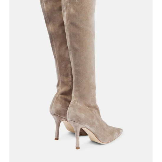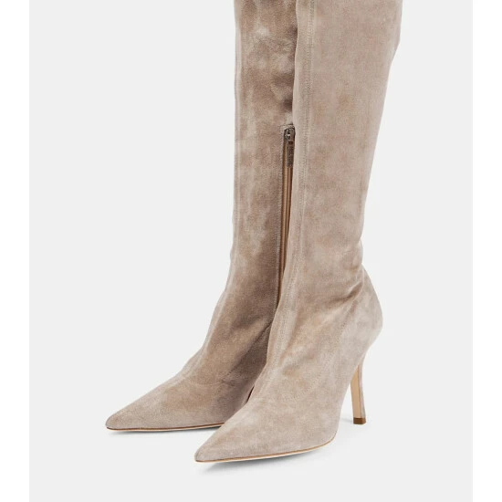 Paris Texas renders its signature over-the-knee boots here in soft taupe suede. The skin-tight pair has piercing pointed toes, and is set atop sophisticated stiletto heels.