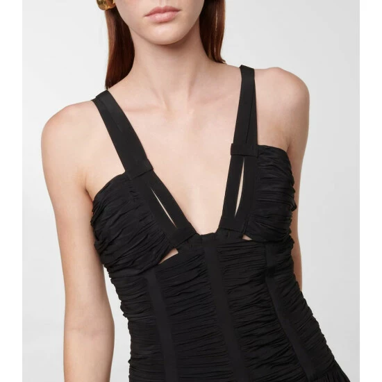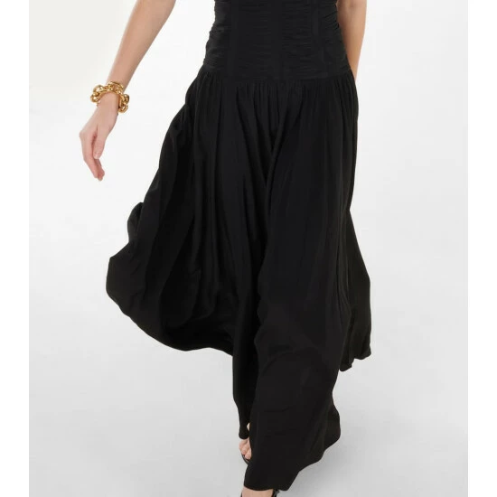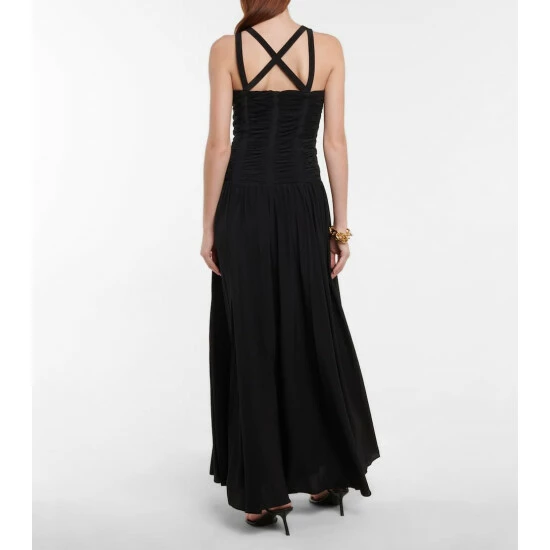 Ulla Johnson’s Anya gown is made from silk crรชpe de chine. It has a paneled, gathered bodice with a plunging neckline and cross-over straps, and a pleated full-length skirt.
