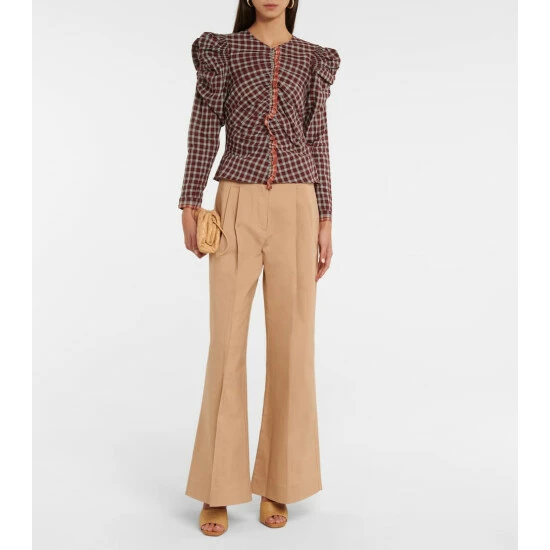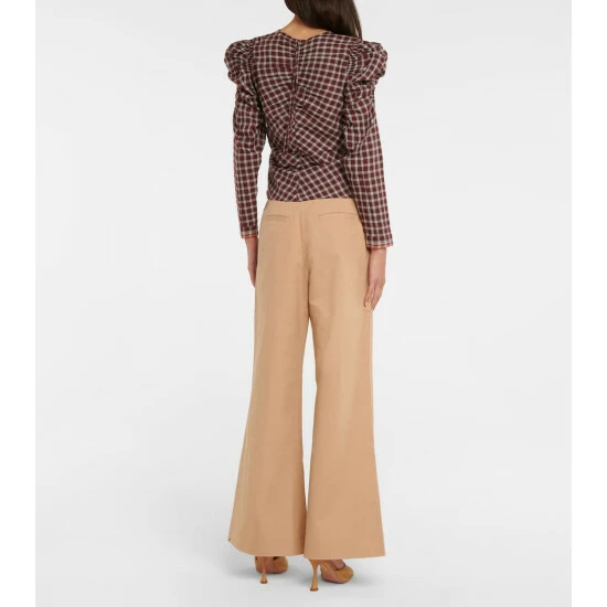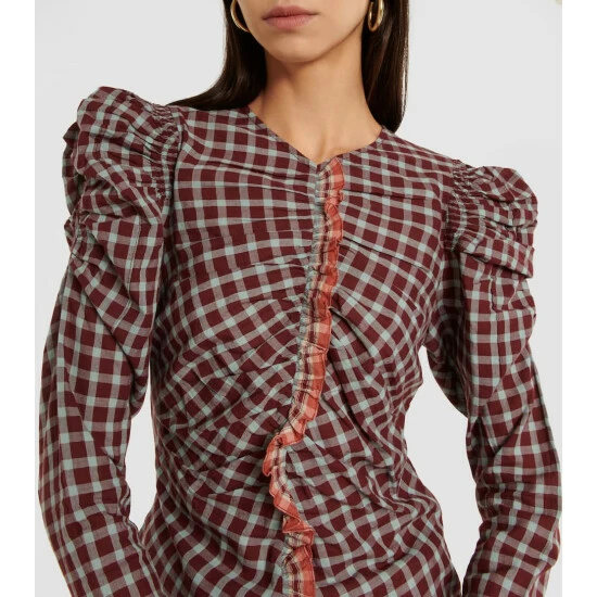 Ulla Johnson’s Blair top is made from checkered cotton with red ruffled trims. It has a close fit with mouton sleeves and a ruched, frilled front seam.