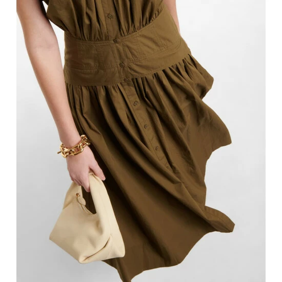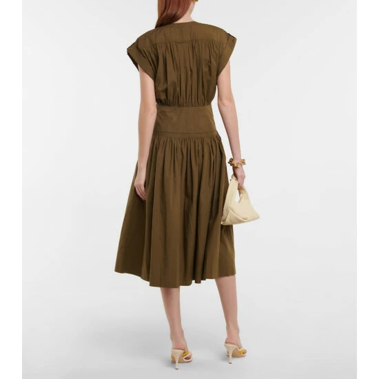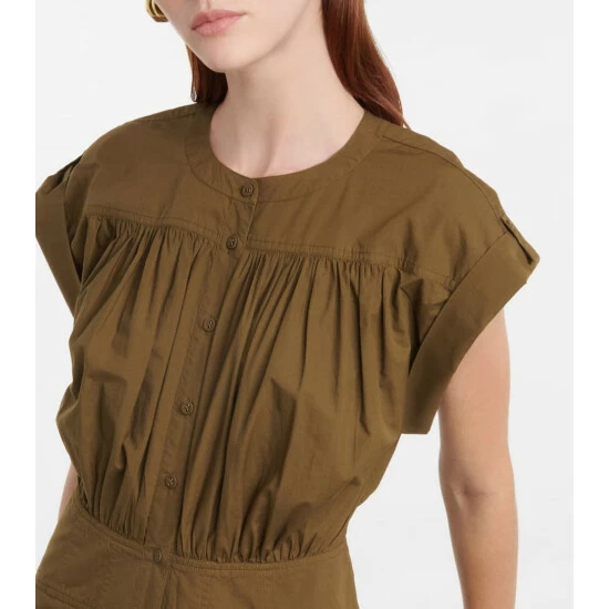 The Charlie midi dress from Ulla Johnson blends a stylish silhouette with utilitarian details. Made from army-green cotton poplin, it features drop shoulders, cuffed sleeves, and buttons that trail all the way down the center.