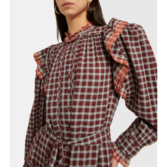 Ulla Johnson’s Romy dress is made from checkered cotton with red ruffled trims. It has a buttoned bodice, a self-tie waist belt and a tiered skirt.