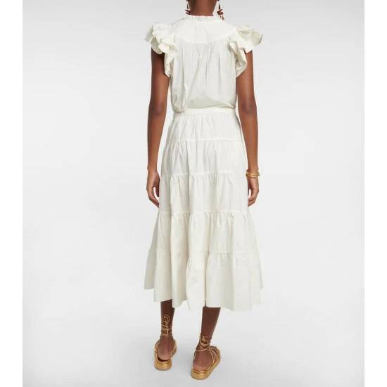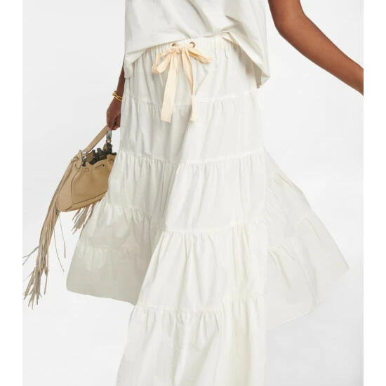 The Wakana maxi skirt from Ulla Johnson is made from off-white cotton poplin with a drawstring waist and a tiered, prairie-style silhouette. Wear it with the matching Kalena crop top for a chic summer set.